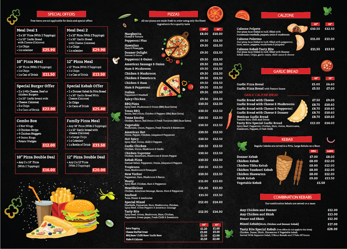 The menu at Tasty Bite offers a wide variety of delicious options for every taste, ranging from kebabs and burgers to pizzas and desserts. The Tray Kebab options include choices like Regular Donner Meat for £6.50, or the more indulgent Donner Meat & Chips for £7.99. For a satisfying burger, diners can enjoy the classic Beef Burger (£3.99) or opt for the spicy Hot Zinger Burger (£4.49). Chicken lovers can indulge in a variety of options, including Chicken Shawarma & Chips (£6.99), Chicken Kebab & Chips (£5.99), or crispy Chicken Wings (£4.49). There’s also a selection of sides such as Jalapeno Cheese Sticks (£2.99) and Curly Fries (£2.49), as well as healthier options like Chicken Salad (£4.99) and Tuna Salad (£3.99). For the little ones, Tasty Bite offers a kids' menu with choices like the Kids 7" Cheese & Tomato Meal (£4.49) and Kids Popcorn Chicken Meal (£4.99). For dessert, treat yourself to Ben & Jerry’s Ice Cream (£3.99) or the indulgent Chocolate Fudge Cake (£2.99). The pizza selection includes classic favorites like Margherita (£5.99) and Pepperoni Plus (£6.49), while the Calzone options offer something a bit different with choices like Calzone Kebab Tasty Bite (£7.99). Whether you’re in the mood for a quick bite or a hearty meal, the menu at Tasty Bite promises to satisfy any craving.